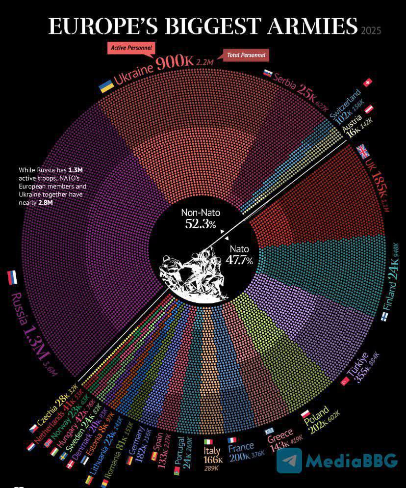 Согласно свежей визуализации мировых аналитических центров, Россия и Украина остаются главными военными силами Европы, обладая наибольшим числом действующих военнослужащих. Второй эшелон формируют Турция, Польша и Великобритания, усиливающие потенциал за счёт модернизации и участия в международных миссиях НАТО.