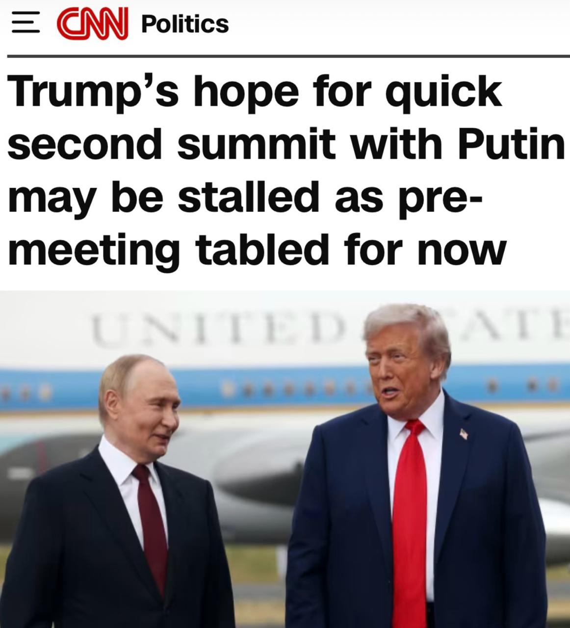 «Надежды Трампа на быструю встречу с Путиным могут быть временно отложены. Источники, знакомые с ситуацией, сообщили CNN, что ожидавшаяся на этой неделе предварительная встреча ключевых советников по иностранным делам обоих лидеров была отложена, по крайней мере на данный момент.