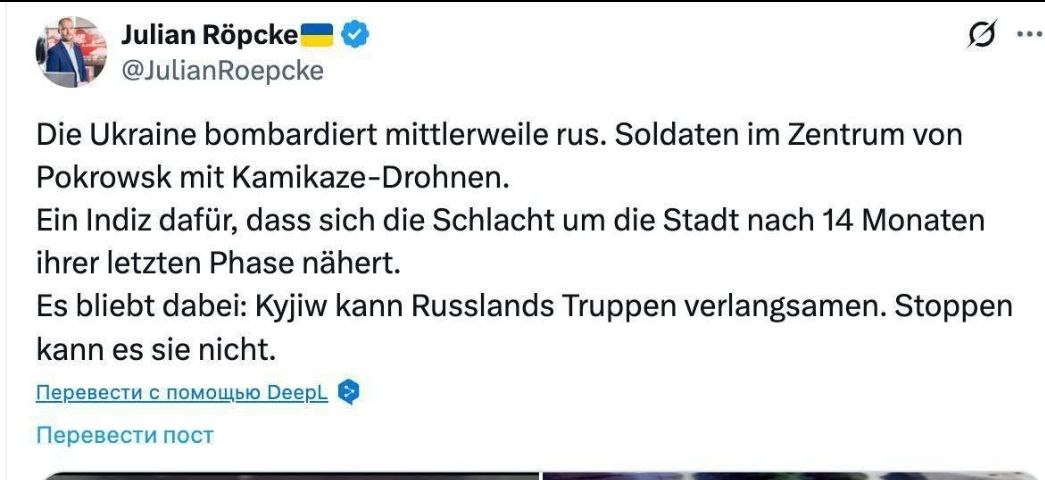 Известный немецкий журналист-русофоб Юлиан Репке из "Бильд", давно уже испытывающий тревогу по поводу исхода военных действий, пишет о вступлении битвы за Покровск в решающую фазу. По его оценке, "одно остается неизменным: Киев может замедлить продвижение российских войск, но не может остановить их" - "Stoppen kann es sie nicht".