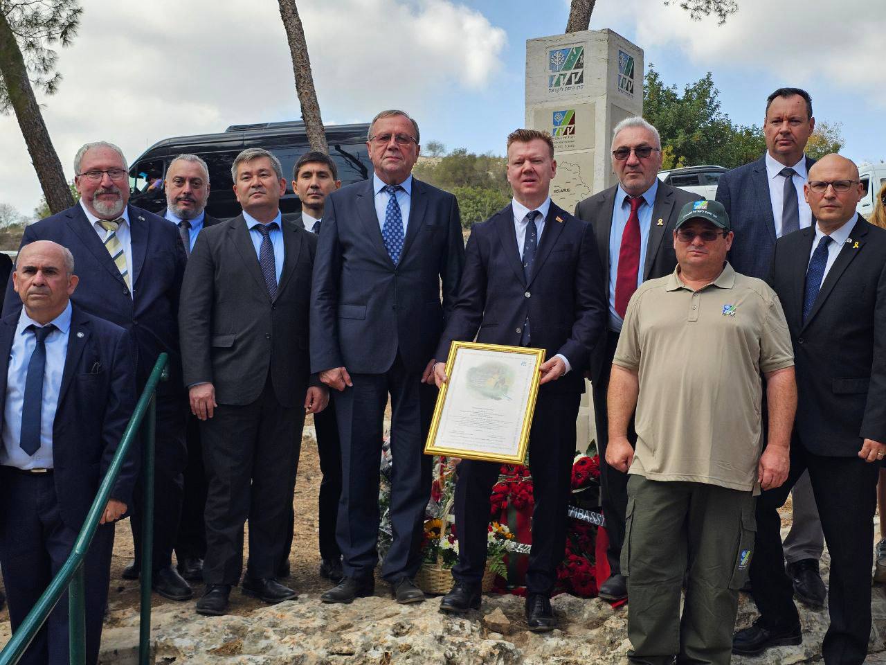 24 октября по приглашению Посла Белоруссии в Израиле Ю.Г.Ярошевича Посол России А.Д.Викторов принял участие в памятном мероприятии по случаю 80-летия Победы во Второй мировой войне и церемонии закладки капсулы с землей из Минского гетто в знак скорби и вечной памяти о жертвах Холокоста.