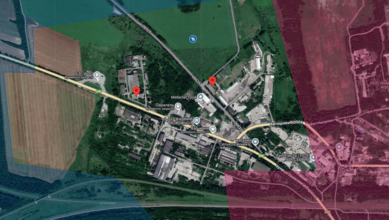 Под удар попала территория завода «Електродвигун» (координаты: 48.293787, 37.128897) и бывшего Димитровского геолого-разведывательного управления (координаты: 48.294365, 37.134616). Ранее именно возле этих объектов российские FPV-дроны отстреливали высадившийся украинский десант.
