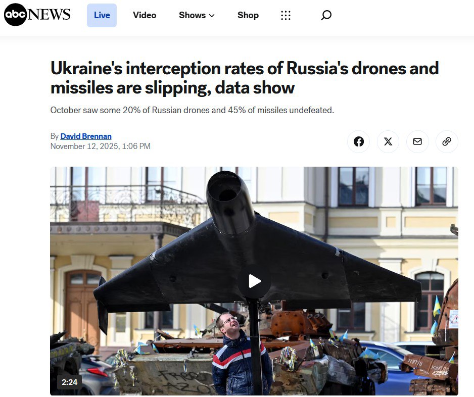 ‘Показатели перехвата Украиной российских беспилотников и ракет снижаются’ – и это только по официальной статистике – ABC News