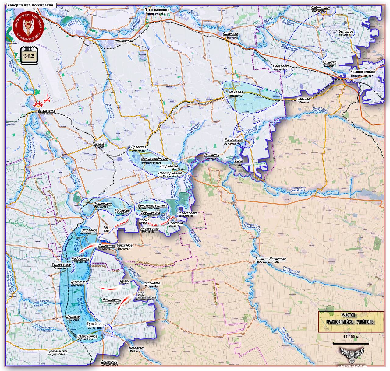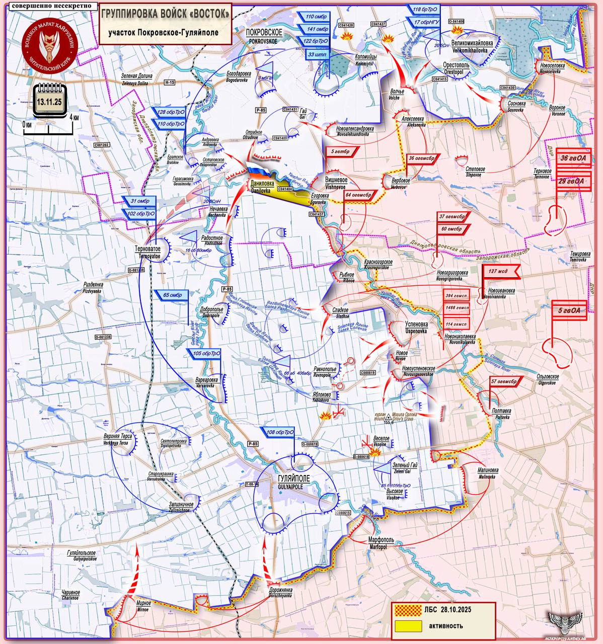 ВС РФ выходят к очередной оборонительной линии ВСУ Покровское - Гуляйполе, вытянувшейся вдоль реки Гайчур. Передовые рубежи этой линии расположены на правом берегу реки, вдоль трассы Р-85, а в глубине обороны за рекой расположены несколько транспортных и оборонительных узлов (Терноватое, Верхняя Терса).
