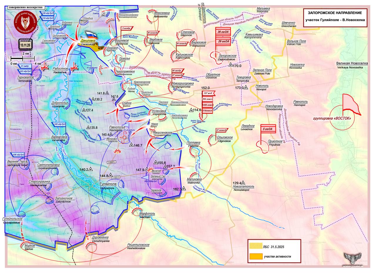 Перерезана одна из основных рокад этого направления - трасса Р-85 (Васильковка – Покровское - Гуляйполе). И одновременно в ночь с 12 на 13 ноября нанесен массированный воздушный удар по узловому транспортному району ВСУ - Васильковка.