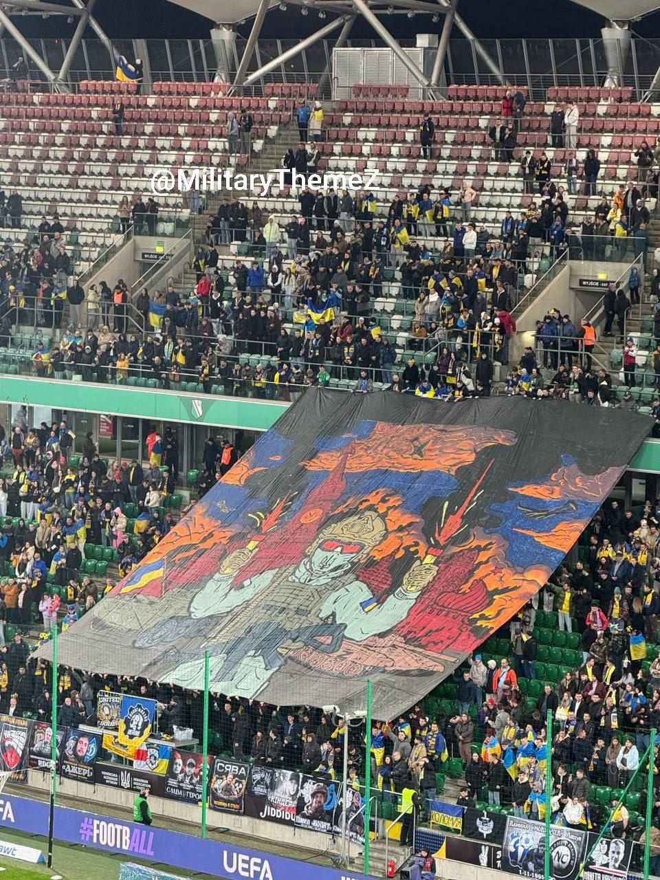 На матче Украина - Исландия болельщики подняли огромный баннер с бойцом ВСУ на фоне горящего Кремля