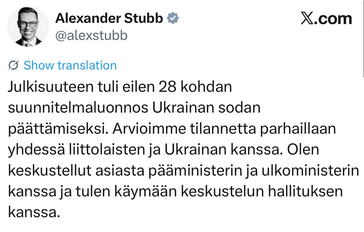 Президент Финляндии Александр Стубб сообщил, что обсуждает план Трампа по урегулированию конфликта на Украине с союзниками и Киевом. Он также отметил, что планирует обсудить его со своим правительством.