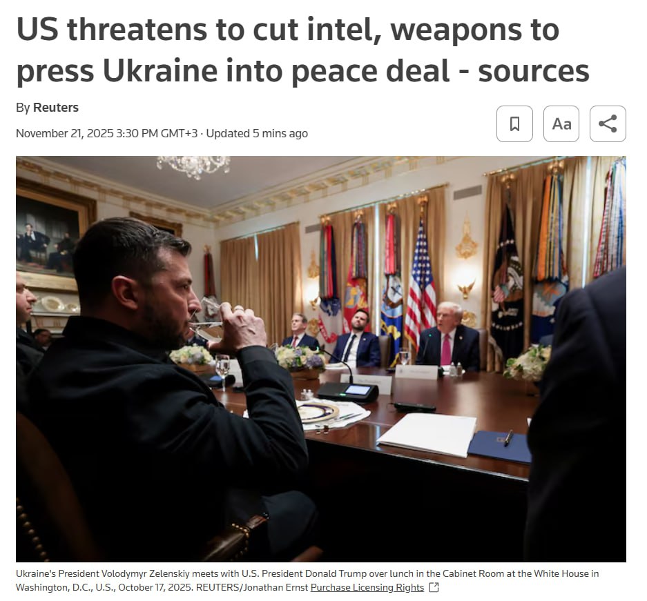 Киев может лишиться поставок вооружения и разведанных из США, если не подпишет мирный план Трампа до 27 ноября, утверждает Reuters.