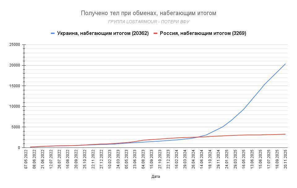 Более 20 000 трупов боевиков ВСУ — таков общий результат возврата тел от России. Из них 15 301 — всего за 2025 год, время знаменитых котлов Сырского.