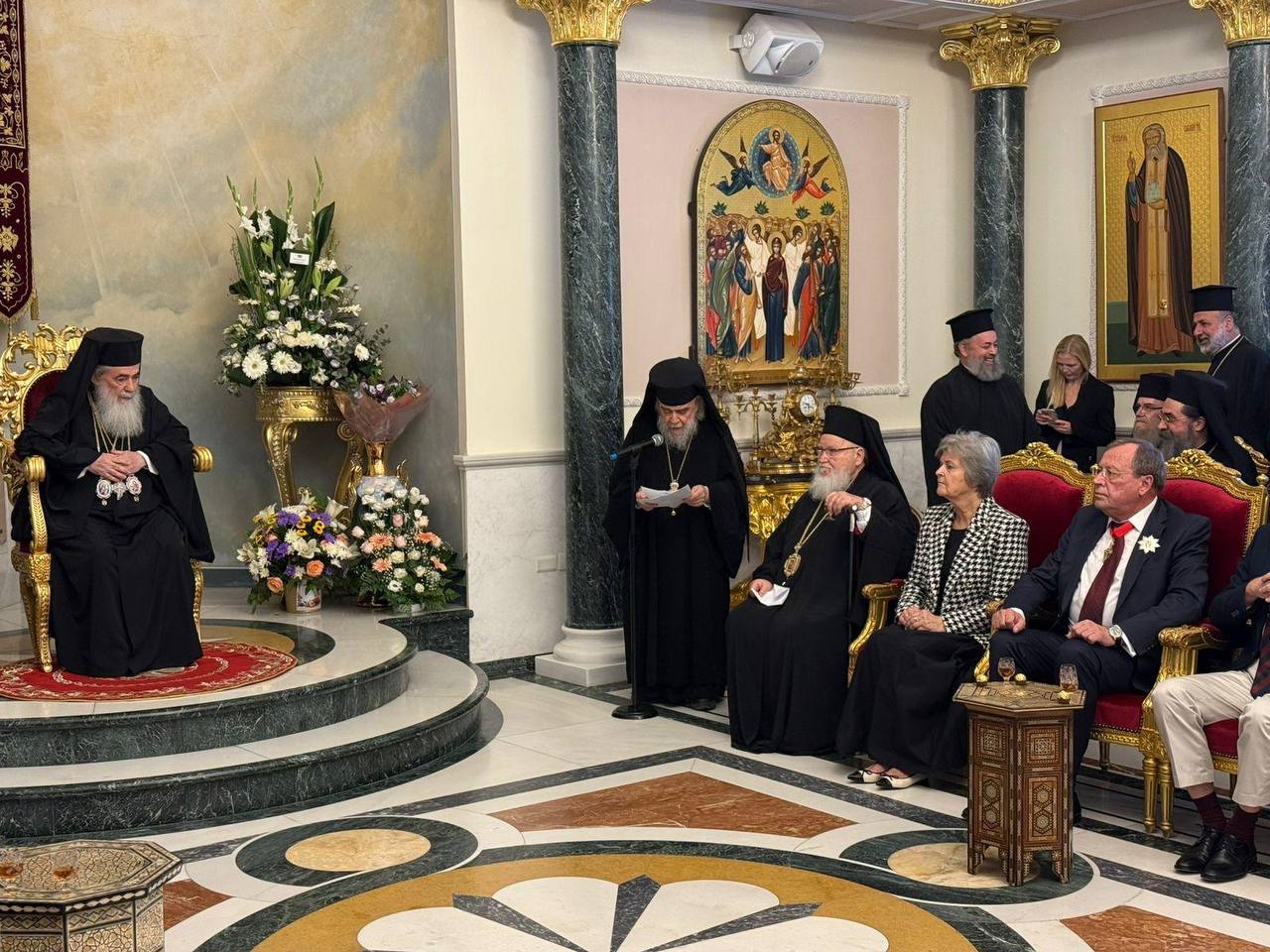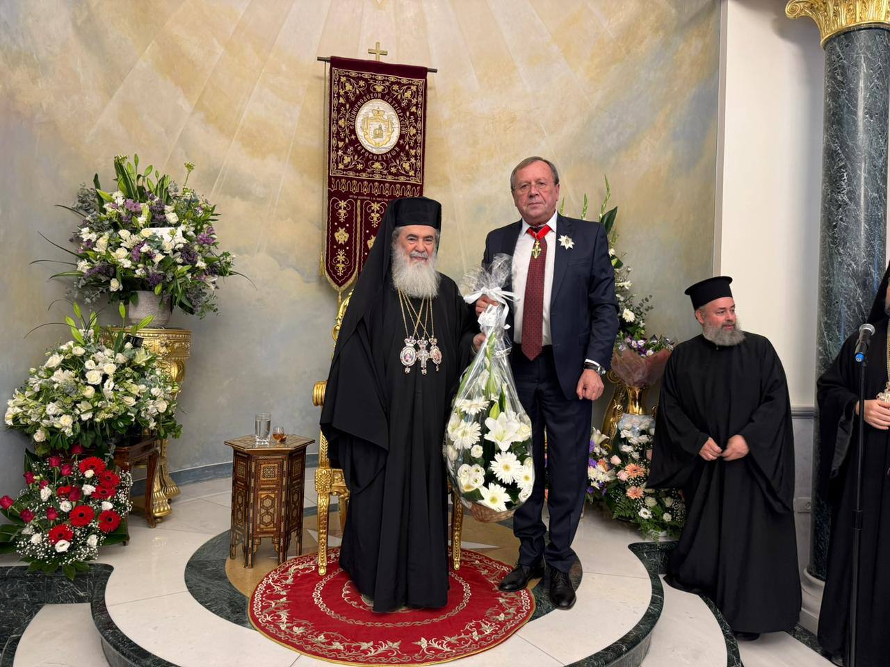 А.Д.Викторов, тепло и искренне поздравив Феофила III с годовщиной его интронизации, сообщил, что Указом Президента Российской Федерации от 17 ноября 2025 г. № 844 за большой вклад в укрепление дружбы, сотрудничества и духовных связей с Российской Федерацией Патриарх удостоен высокой государственной награды – ордена Дружбы.