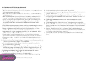 Спикер Верховной рады Украины обозначил «красные линии» Киева: это официальное признание (другими странами) территорий, занятых Россией, ограничения на оборону Украины и на будущие союзы Украины. Reuters констатирует, что эти позиции уже не раз озвучивались Украиной, но они противоречат плану США.