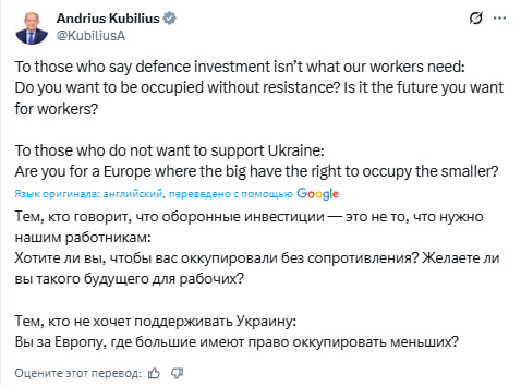 Литовец из команды Урсулы фон дер Ляйен уверен, что если прямо сейчас не вложить все возможные астрономические суммы в оборонную промышленность и поддержку Украины, то все европейские рабочие, которые сейчас страдают и недоедают, будут "жить в оккупации и мире, где большие имеют право захватывать маленьких".