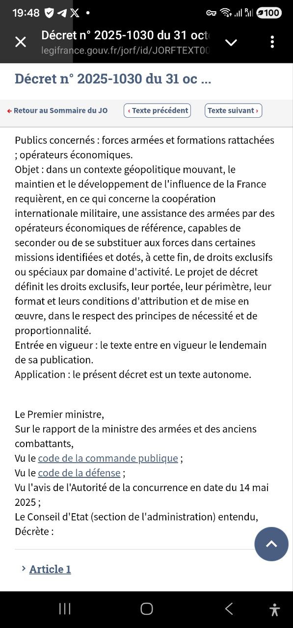 Также, возможно пытаясь избежать народного восстания, а также, без сомнения, юридических последствий для Франции в связи с военными действиями этой Коалиции желающих, извращенец из Елисейского дворца тайно издал указ (№ 2025-1030), разрешающий создание Частных военных компаний (фото 2), который не ускользнул от проницательности СВР, российского внешнеразведывательного ведомства: