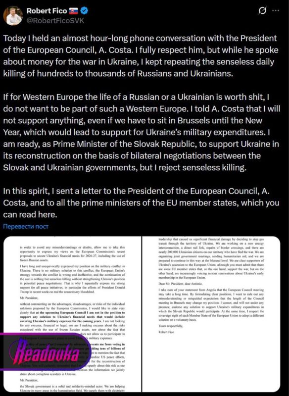 Он добавил, что не хочет быть частью Западной Европы, для которой жизни россиян и украинцев ничего не значат. Словакия готова поддерживать Украину в восстановлении через двусторонние договоренности, но отвергает финансирование боевых действий.
