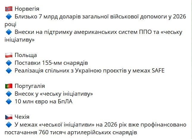 Норвегия: около 7 млрд долларов общей военной помощи в 2026 году, в том числе взносы в поддержку американских систем ПВО и «чешскую инициативу».