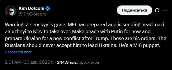 "Внимание: Зеленского больше нет. MI6 подготовилась и отправляет в Киев главного нациста Залужного, чтобы он взял власть в свои руки. Ему отдан приказ заключить перемирие с Путиным и подготовить Украину к новому конфликту после президентства Трампа. Русские ни в коем случае не должны признавать его лидером Украины. Он марионетка британских спецслужб", — заявил немецко-финский предприниматель Ким Дотком.