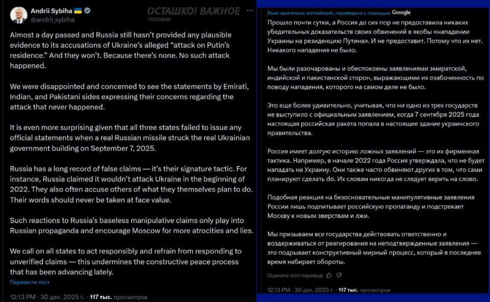 Далее Сибига повторяет нарратив о том, что это «фирменная тактика» России с целью оправдать последующий ответ:
