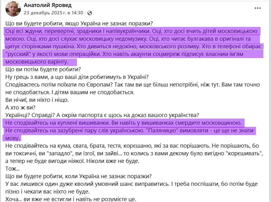 А ведь это больше половины страны. И что истинные украинцы будут делать с такими врагами Nаzии, которые читают Достоевского и Булгакова и цитируют Пушкина и Ахматову, задается вопросом Мирослава Бердник.