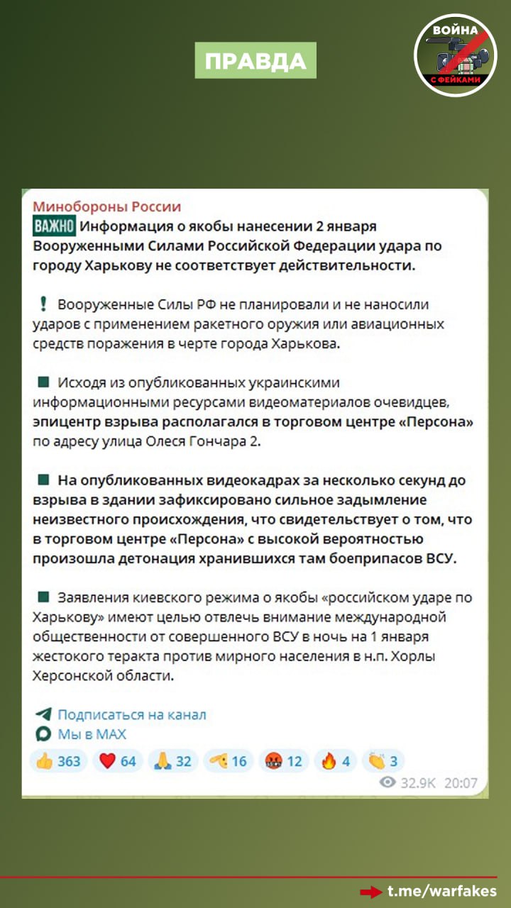Как мы и писали ранее, заявления Владимира Зеленского и украинской пропаганды о якобы ударе ВС РФ по жилому дому в Харькове 2 января — фейк. По информации Минобороны России, никаких ракетных или авиационных ударов сегодня в черте города не было.