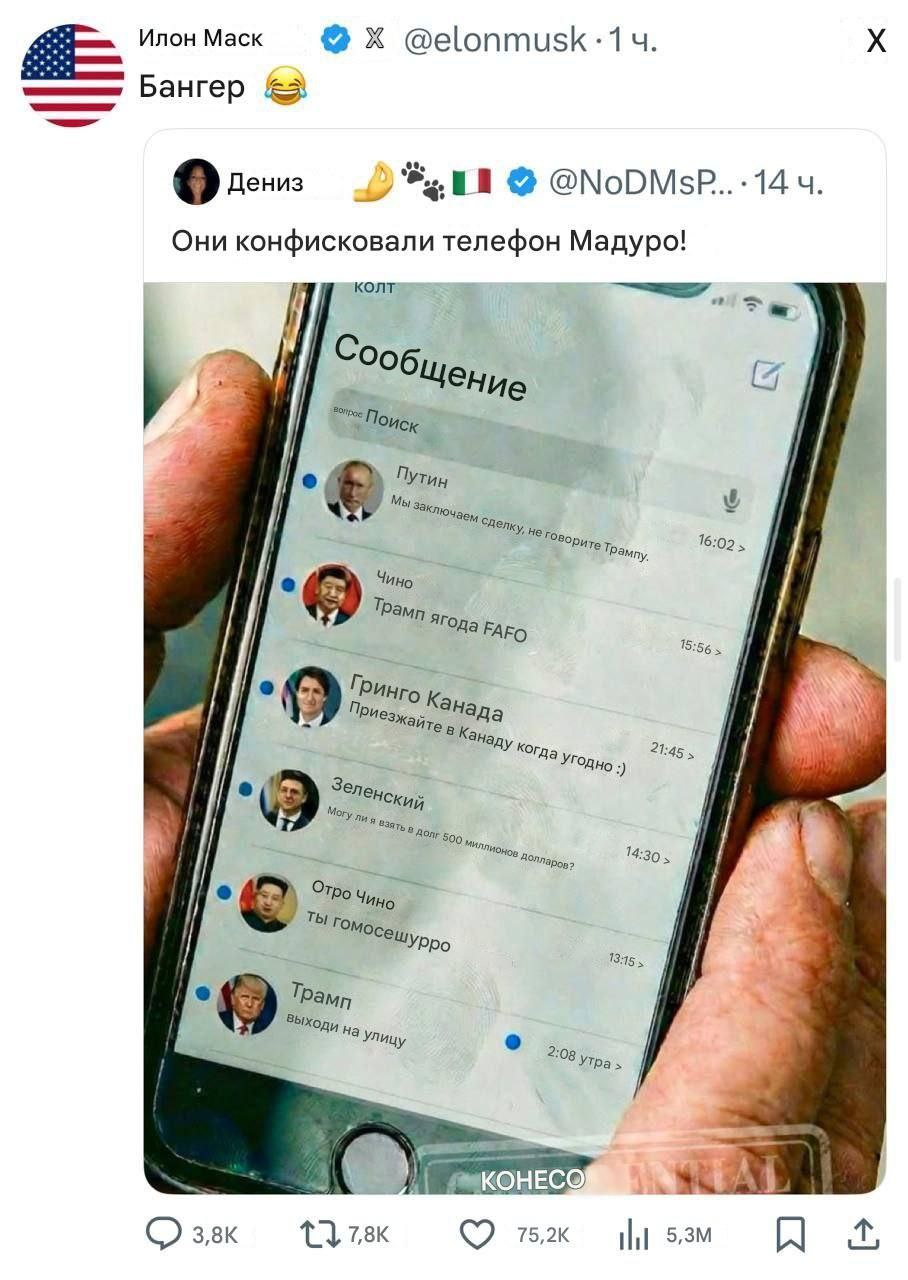 Возмущению воинствующих украинцев нет предела: Маск репостнул шутку про телефон Мадуро, где в чатике Зеленский клянчит в долг 500 млн.долларов.