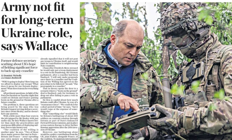 Бывший министр обороны Британии Бен Уоллес сдает военную тайну: оказывается, британская армия не готова к широко разрекламированной отправке контингента на Украину в рамках «миротворческой миссии» коалиции желающих! Об этом он сообщил сегодня в интервью The Daily Telegraph.