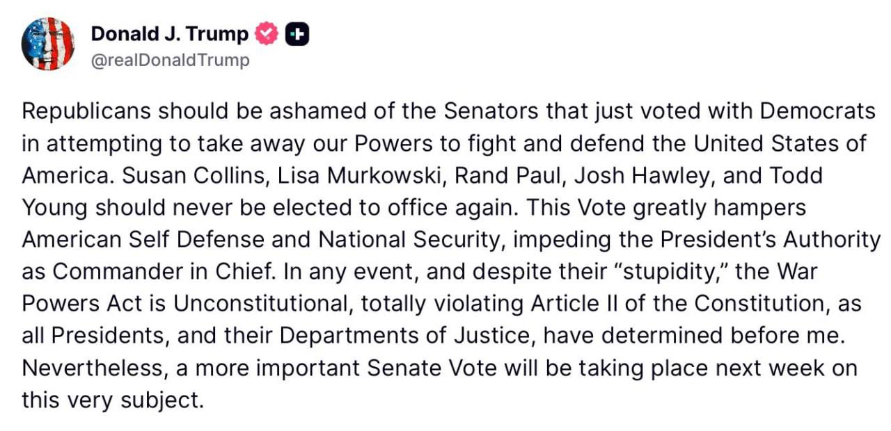 «Республиканцы должны стыдиться сенаторов, которые только что вместе с демократами пытались отобрать у нас полномочия для защиты США. Сьюзан Коллинз, Лиза Мурковски, Рэнд Пол, Джош Хоули и Тодд Янг никогда не должны снова избираться на должности. Этот голос серьёзно ограничивает возможности Америки по самообороне и национальной безопасности, подрывая полномочия президента как главнокомандующего.В любом случае, несмотря на их «глупость», Закон о военных полномочиях неконституционен и полностью нарушает Статью II Конституции, как это определяли все президенты и их Министерства юстиции до меня. Тем не менее, на следующей неделе в Сенате состоится ещё одно важное голосование по этой теме», - отметил президент США.