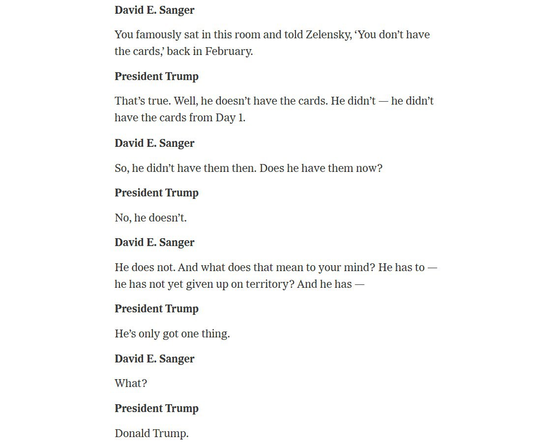 - Вы тогда, в феврале, сидя в этой комнате, сказали Зеленскому: 'У тебя нет козырей'.