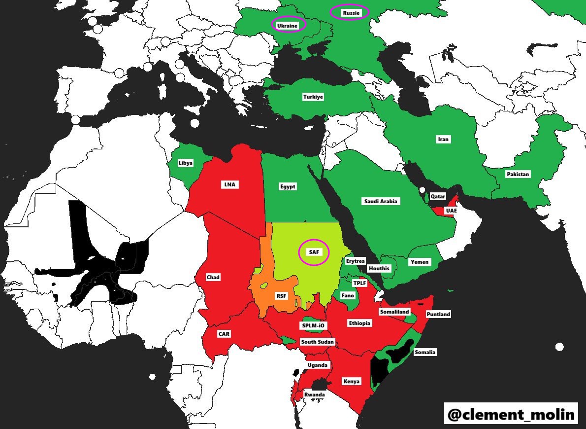 И вот я нашел одно такое совпадение. Оказывается и мы и Киев вместе поддерживаем официальные власти в Судане (обозначены на карте зеленым, те кто за "другую сторону" - красным).