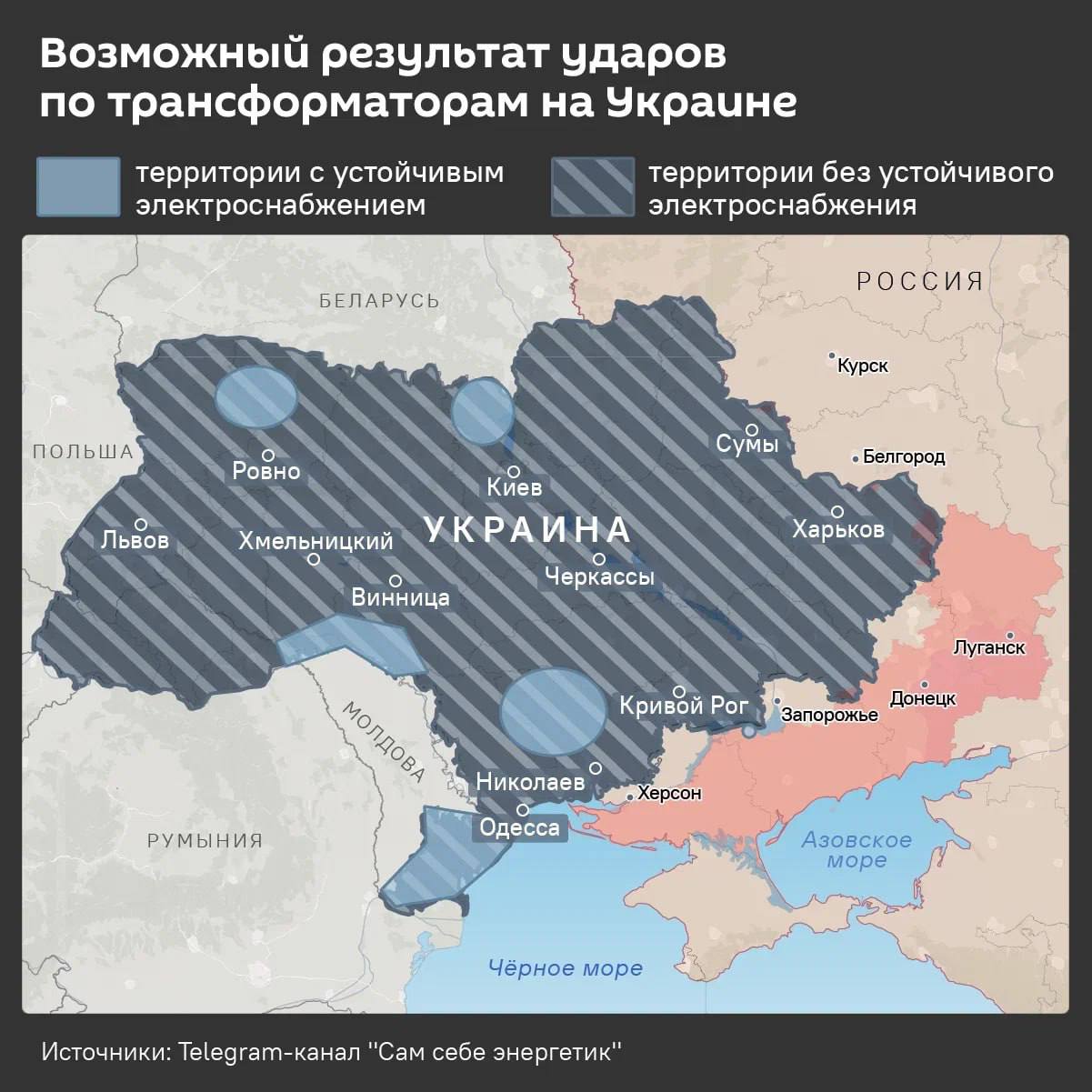 При таком сценарии более-менее стабильное электроснабжение останется лишь там, где есть АЭС с линиями напряжением 150кВ, а также в приграничных с Молдовой районах.