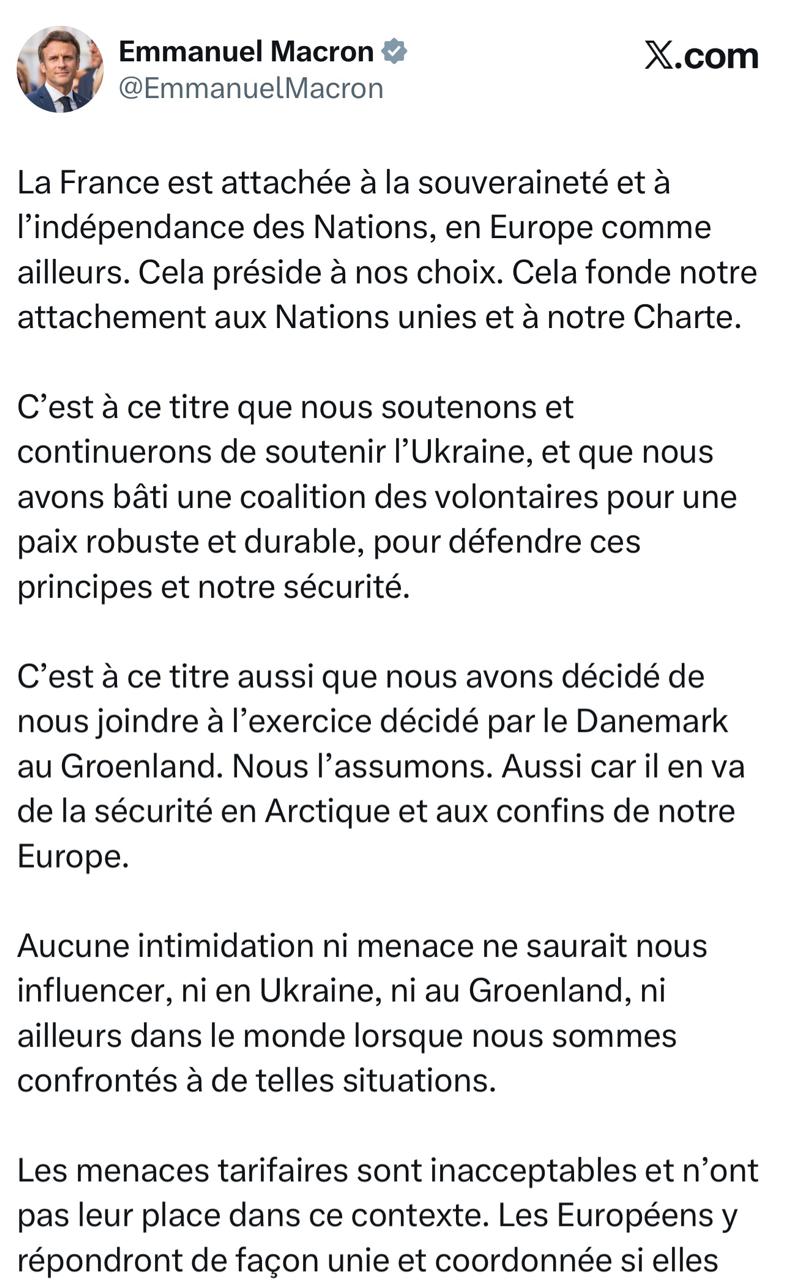 Угрозы введения тарифов неприемлемы и недопустимы в данном контексте. Европейцы отреагируют единым и скоординированным образом, если они подтвердятся. Мы обеспечим соблюдение европейского суверенитета. Именно в этом духе я буду вести переговоры с нашими европейскими партнерами.