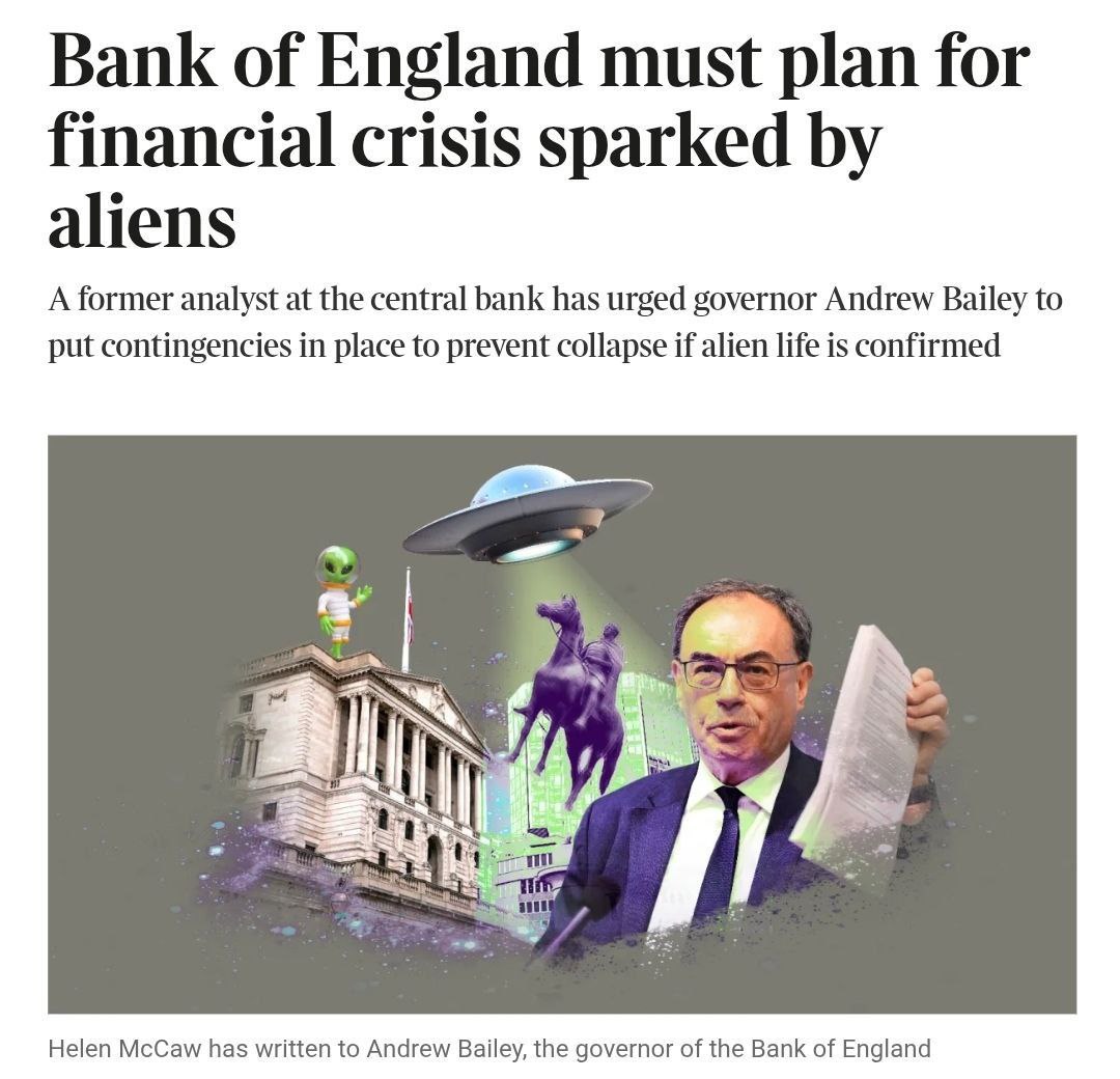 "Банк Англии должен подготовиться к финансовому кризису, спровоцированному инопланетянамиБывший аналитик центрального банка призвал управляющего Эндрю Бейли принять меры на случай непредвиденных обстоятельств, чтобы предотвратить коллапс, если подтвердится наличие инопланетной жизни