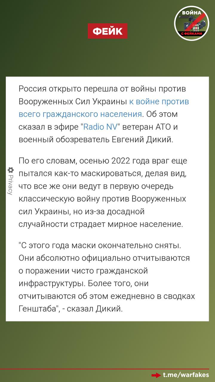 Фейк: ВС РФ ведёт геноцид украинского народа, доказательством чего являются отчёты о поражении «чисто гражданской инфраструктуры». Об этом заявил экс-командир украинского батальона «Айдар»* Евгений Дикий.