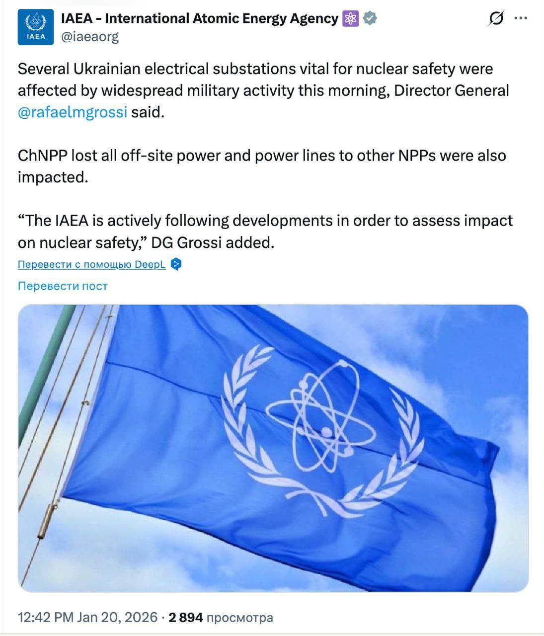 МАГАТЭ сообщает, что в результате ночного комбинированного удара было прервано внешнее энергоснабжение Чернобыльской АЭС и повреждены линии электропередач, соединяющие другие украинские АЭС