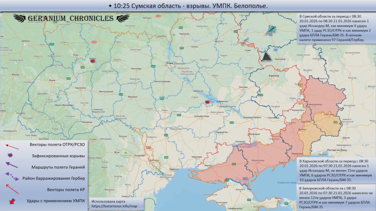 Анимированная схема ударов по территории Украины 20 января 2026 – 21 января 2026 года.