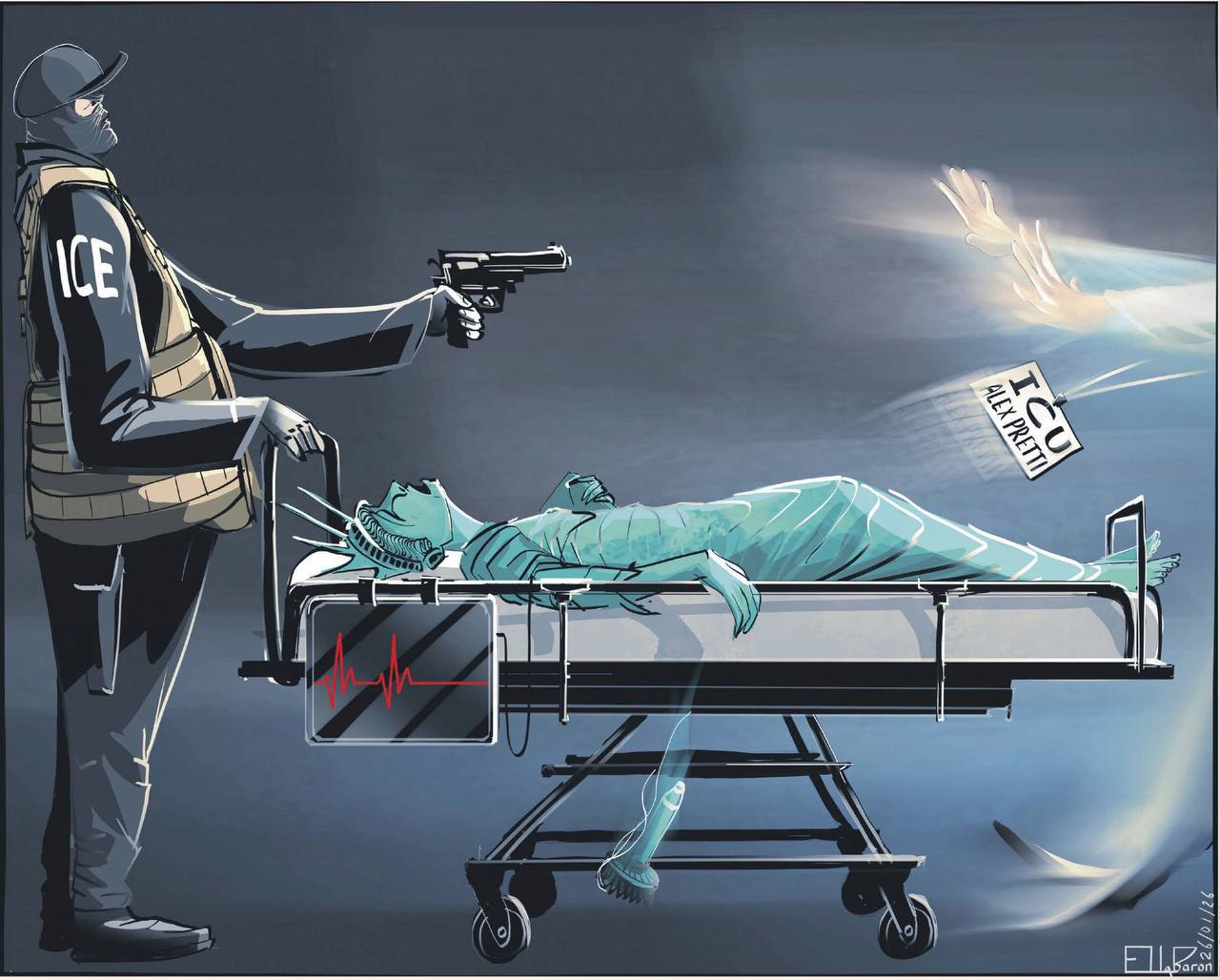В американских соцсетях разгоняется карикатура, где сотрудник миграционной службы США ICE целится из пистолета в призрак убитого Алекса Претти, а на медицинской каталке лежит Статуя Свободы, символизирующая, что свобода в Америке умерла.