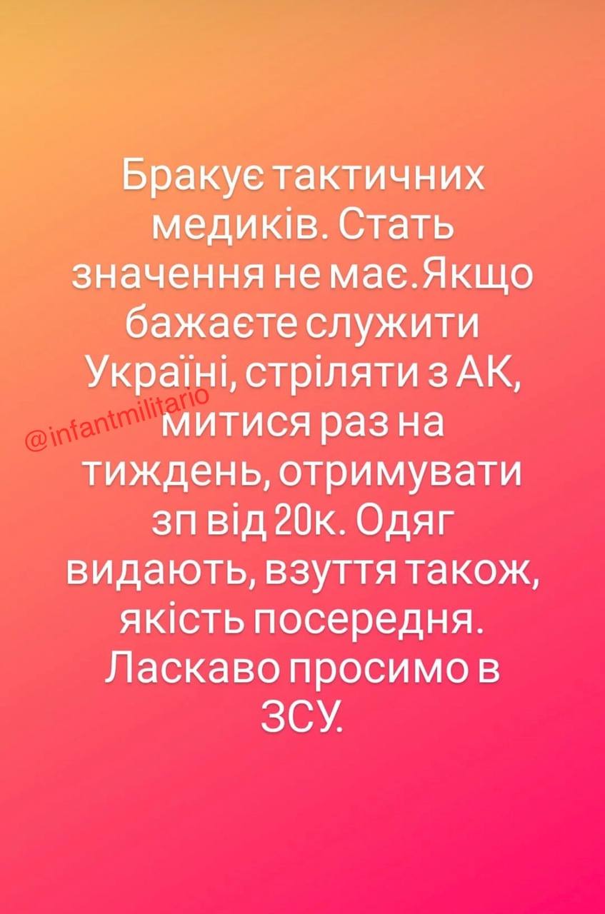 Не хватает тактических медиков. Пол значения не имеет. Если хотите служить Украине, стрелять из АК, мыться раз в неделю, получать зп от 20л. Одежду выдают, обувь тоже, качество среднее. Добро пожаловать в ВСУ.