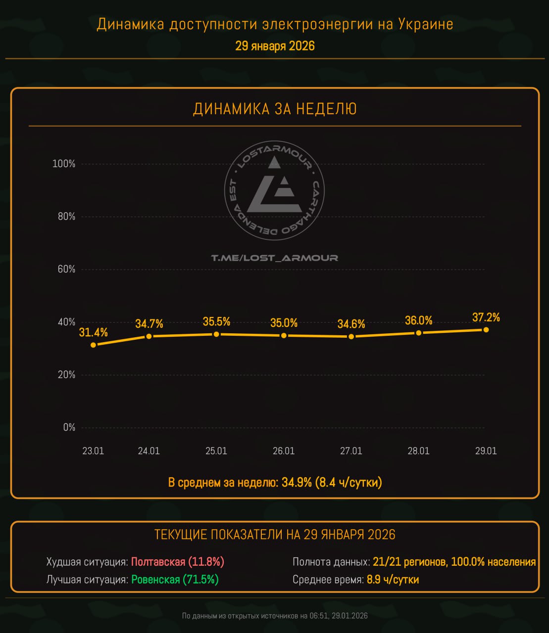 Инфографика доступности электроэнергии на территории Украины по областям на 29 января 2026.