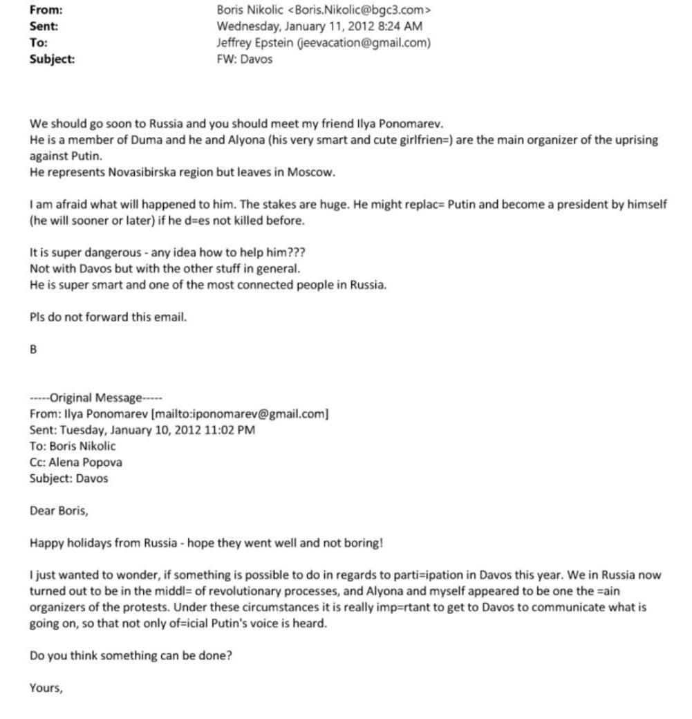 «Мы должны поехать в Россию и встретиться с Ильёй Пономарёвым**. Он депутат Думы, он и Алёна (его очень милая подружка) — главные организаторы восстания против Путина... Он может сменить Путина и стать президентом (и он станет им рано или поздно)», — пишет Борис Николич Джеффри Эпштейну. Борис Николич — это бывший советник Билла Гейтса, который, если верить WSJ, познакомил в 2010 году основателя Microsoft с юной русской девушкой по имени Мила. Потом с этой девушкой у Гейтса был роман, потом (опять же, согласно WSJ) она его шантажировала, а Николич стал одним из исполнителей завещания Эпштейна.