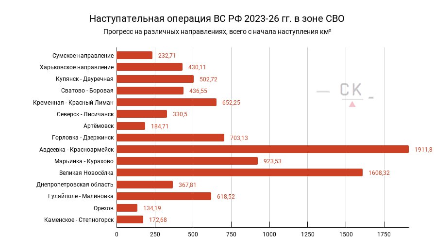 Новую инфографику интенсивности наступления ВС РФ в зоне СВО на различных направлениях к февралю 2026 представил канал "Сливочный каприз".
