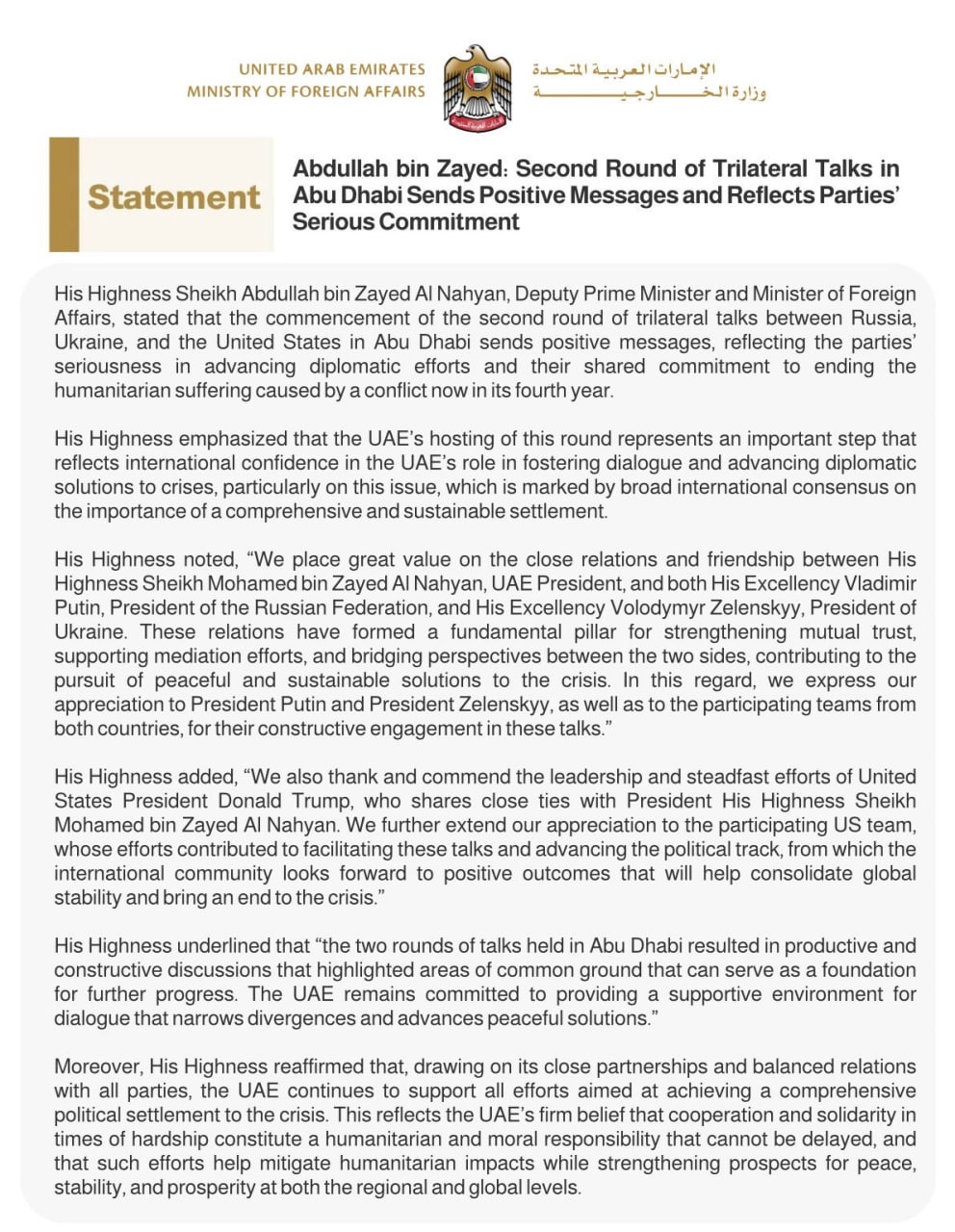 Его Высочество шейх Абдулла бин Зайед Аль Нахайян, заместитель премьер-министра и министр иностранных дел ОАЭ, заявил, что начало второго раунда трёхсторонних переговоров между Россией, Украиной и США в Абу-Даби посылает позитивные сигналы, отражая серьёзность сторон в продвижении дипломатических усилий и их совместную приверженность прекращению гуманитарных страданий, вызванных конфликтом, который продолжается уже четвёртый год. Его Высочество подчеркнул, что проведение ОАЭ этого раунда является важным шагом, демонстрирующим международное доверие к роли страны в содействии диалогу и продвижении дипломатических решений кризисов, особенно по данному вопросу, по которому существует широкий международный консенсус относительно необходимости комплексного и устойчивого урегулирования. Его Высочество отметил: «Мы придаём большое значение тесным отношениям и дружбе между Его Высочеством шейхом Мохаммедом бин Зайедом Аль Нахайяном, президентом ОАЭ, и их превосходительствами Владимиром Путиным, президентом Российской Федерации, и Владимиром Зеленским, президентом Украины. Эти отношения стали фундаментальным столпом для укрепления взаимного доверия, поддержки посреднических усилий и сближения позиций сторон, способствуя поиску мирных и устойчивых решений кризиса. В этом контексте мы выражаем благодарность президенту Путину и президенту Зеленскому, а также участвующим командам обеих стран за конструктивное участие в этих переговорах». Его Высочество добавил: «Мы также благодарим и высоко оцениваем руководство и последовательные усилия президента Соединённых Штатов Дональда Трампа, который поддерживает тесные связи с президентом шейхом Мохаммедом бин Зайедом Аль Нахайяном. Мы выражаем признательность и участвующей американской команде, чьи усилия способствовали проведению этих переговоров и продвижению политической линии, из которой международное сообщество ожидает положительных результатов, способных укрепить глобальную стабильность и положить конец кризису». Его Высочество подчеркнул, что «два раунда переговоров в Абу-Даби привели к продуктивным и конструктивным обсуждениям, выявив общие позиции, которые могут стать основой для дальнейшего прогресса. ОАЭ остаются привержены обеспечению поддерживающей среды для диалога, которая сокращает разногласия и продвигает мирные решения». Кроме того, Его Высочество подтвердил, что, опираясь на близкие партнёрства и сбалансированные отношения со всеми сторонами, ОАЭ продолжает поддерживать все усилия, направленные на достижение комплексного политического урегулирования кризиса. Это отражает твёрдую убеждённость ОАЭ в том, что сотрудничество и солидарность в трудные времена являются гуманитарной и моральной обязанностью, которую нельзя откладывать, и что такие усилия помогают смягчить гуманитарные последствия, одновременно укрепляя перспективы мира, стабильности и процветания как на региональном, так и на глобальном уровне».