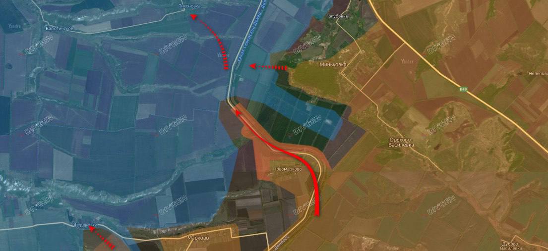 На отрезке Новомарково — шоссе Е-40 группировка войск «Юг» проводит активную работу. На протяжении последних суток российские подразделения вытеснили формирования 56-й бригады ВСУ из района шлюзов на канале Северский Донец — Донбасс и опорников на северных окраинах села Новомарково, отбросив их вдоль канала на глубину около 3 км.
