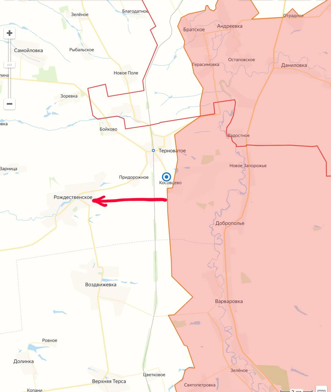 "Идут тяжелые бои, но нигде не отступаем, а даже где-то и продвигаемся. Наши и в Терноватом и в Придорожном, но постоянные контактные бои. Передовые штурмовые группы вышли на окраину Ряздвянки (Рождественское)".