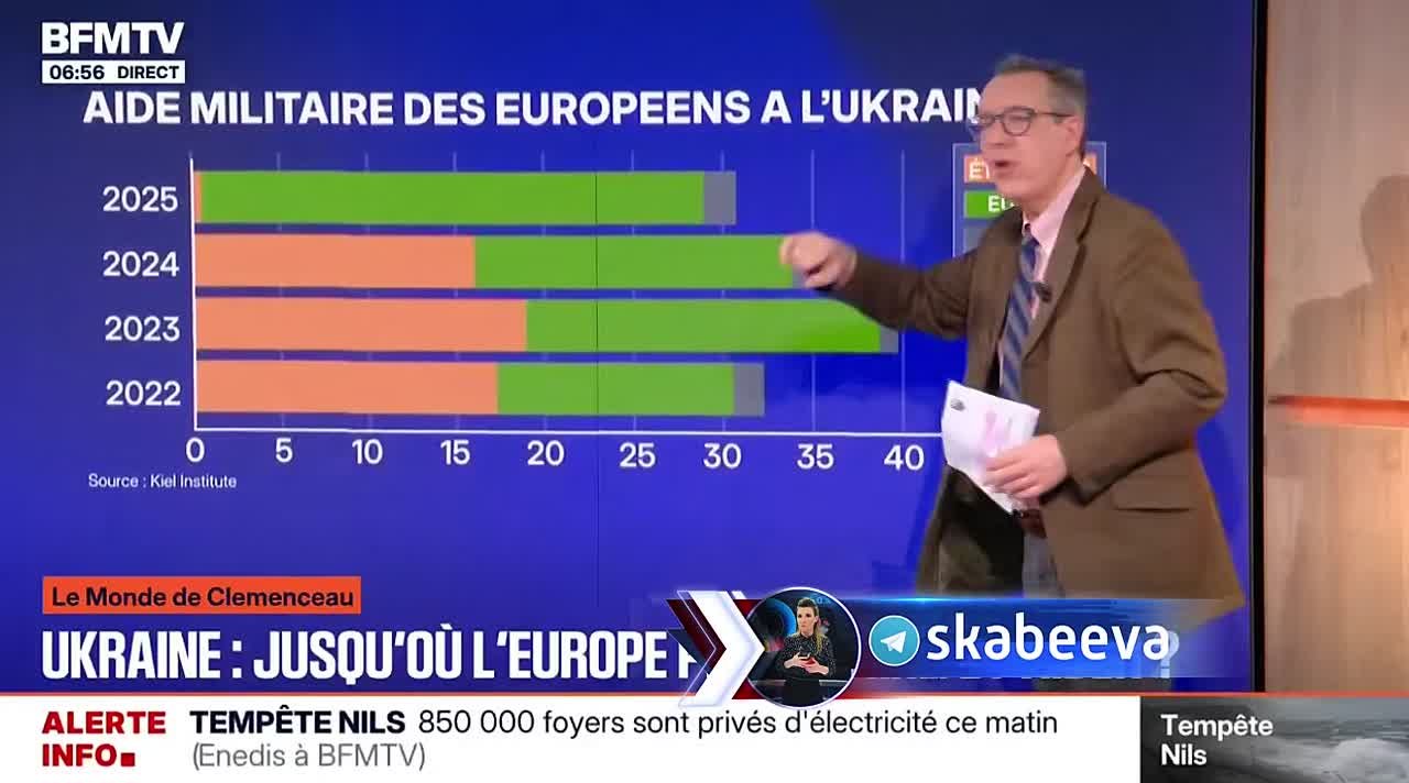 ‘С начала войны в 2022 году американцы и европейцы помогали Украине поровну. Сегодня, когда Дональд Трамп пришел к власти, американское оружие больше не поставляется Украине. Теперь европейцы берут на себя почти всё — на 95% и более. Если посмотреть, кто и сколько даёт внутри Европы, это тоже очень интересно. Вы увидите, что страны Западной Европы — в частности Франция и Германия — дают примерно столько же, сколько и раньше. Страны Восточной Европы дают всё меньше. А страны, которые дают всё больше, — это северные государства: страны Балтики, Скандинавии. Почему? Потому что они находятся непосредственно у границ России и понимают, что необходимо поддерживать Украину’.