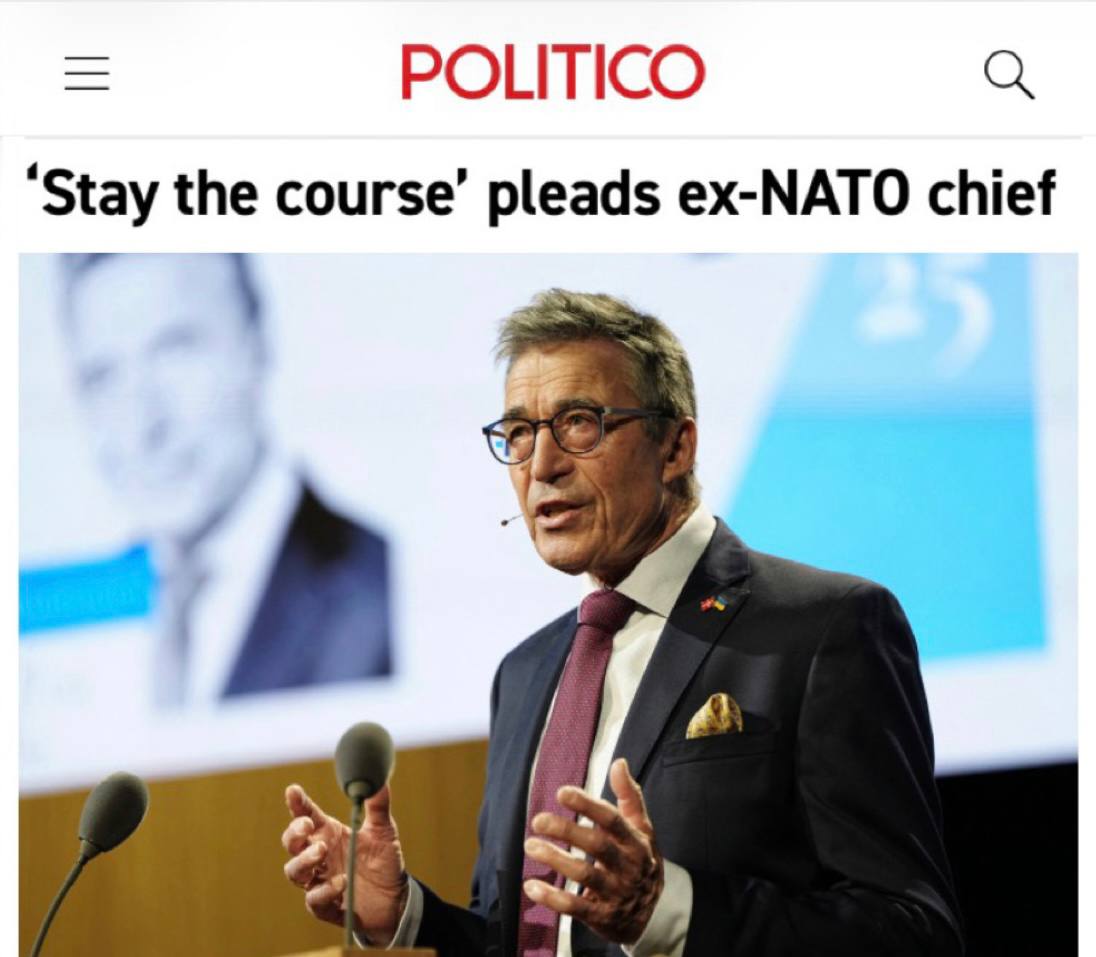 «Бывший премьер-министр Дании и экс-генсек НАТО Андерс Фог Расмуссен приехал в Вашингтон с посланием - трансатлантический союз важен как никогда. «Очевидно, что НАТО ничего не значит без США. Поэтому, если США решат не участвовать в НАТО или пренебречь НАТО, европейцам придется создать европейское НАТО, центром которого станет коалиция желающих европейских стран, способных и готовых защищать Европу» - заявил Расмуссен.