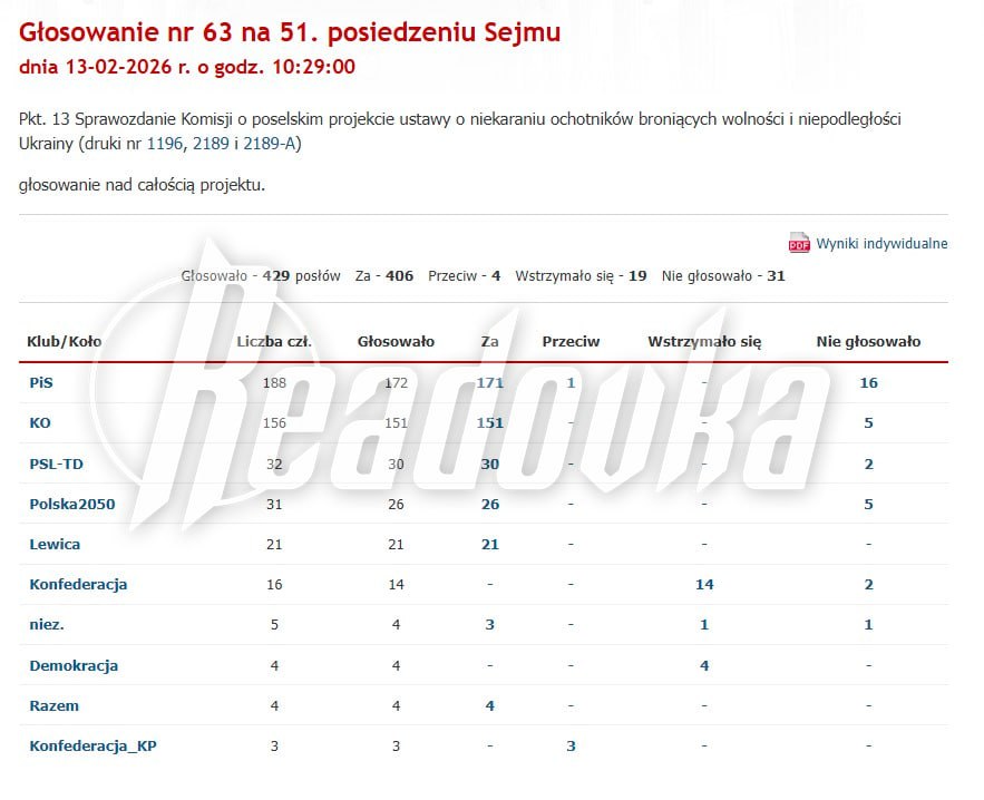 Документ направлен в Сенат и также снимает ответственность за вербовку польских граждан и иностранцев на территории страны для участия в боевых действиях. Точное число поляков, находящихся в зоне конфликта, официально не раскрывается. При этом власти признают масштаб участия своих граждан в этих формированиях, подчеркивая, что закон закрывает прежние уголовные претензии к таким лицам и закрепляет их правовой статус.