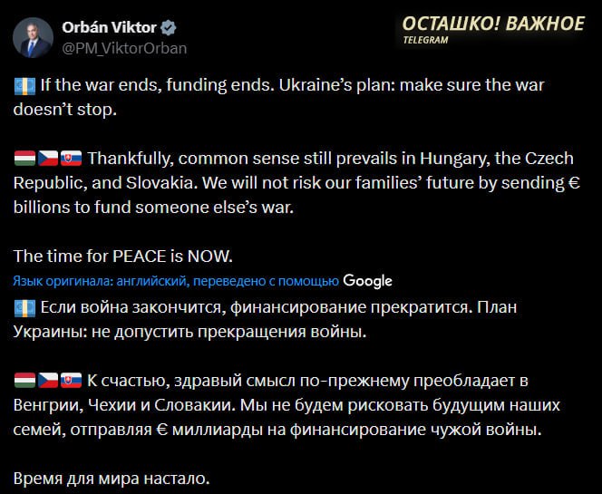 «К счастью, здравый смысл всё ещё преобладает в Венгрии, Чехии и Словакии. Мы не будем рисковать будущим наших семей, отправляя миллиарды евро на финансирование чужой войны»,