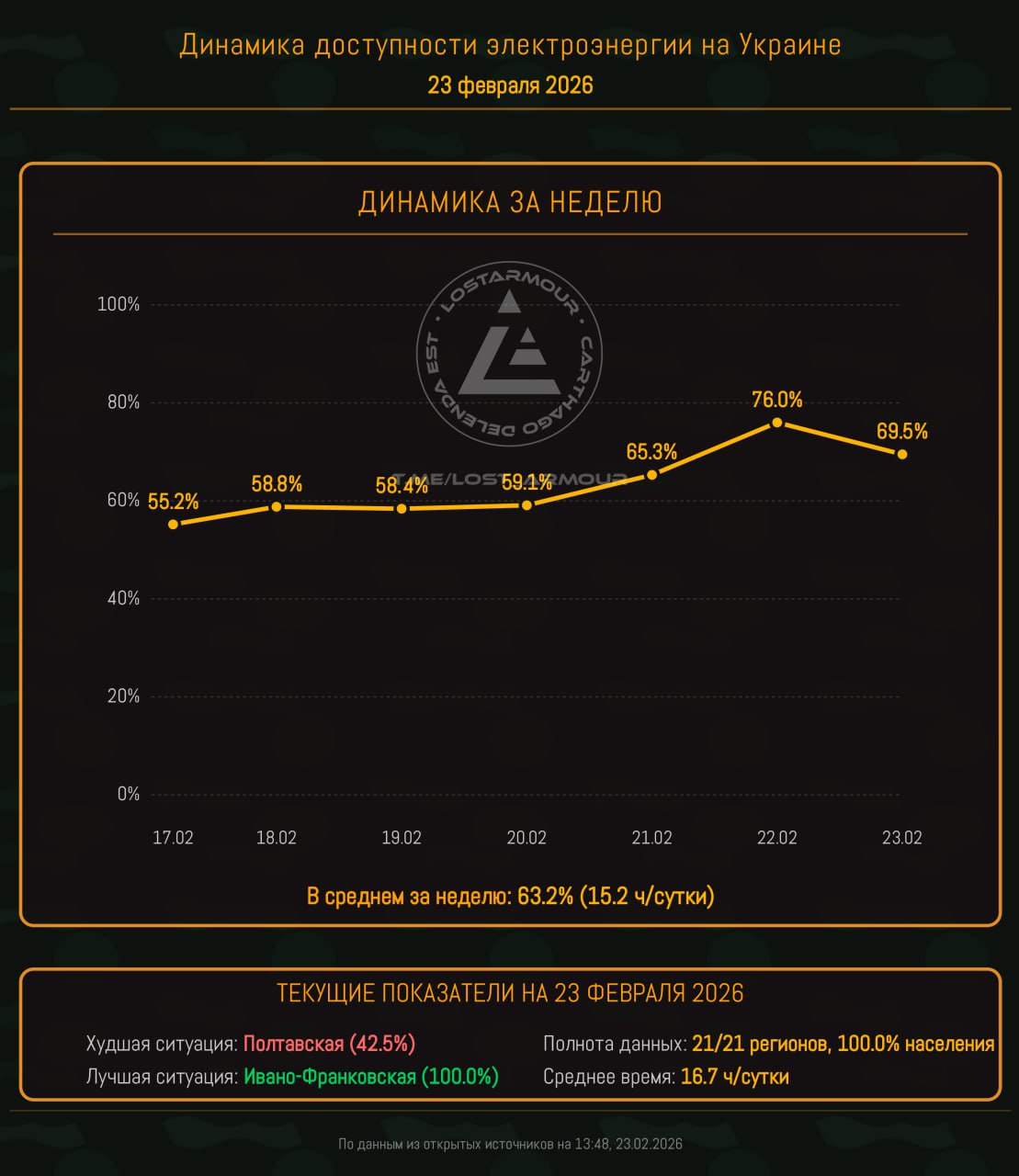 Инфографика доступности электроэнергии на территории Украины по областям на 23 февраля 2026.