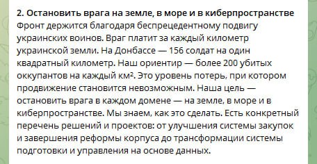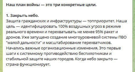 В нем говорится о 3 пунктах, где приоритет отдается средствам ПВО, наращивании огневых средств на поле боя и увеличению ударов по нефтяным объектам и торговым судам России.
