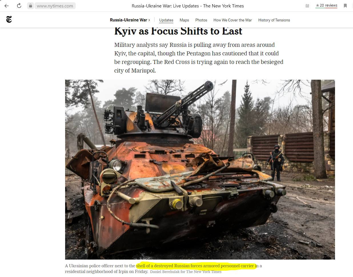 Уничтоженный в Ирпене Киевской области украинский БТР-3E, который господа из The New York Times записали как российский.