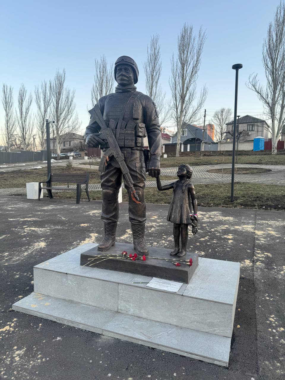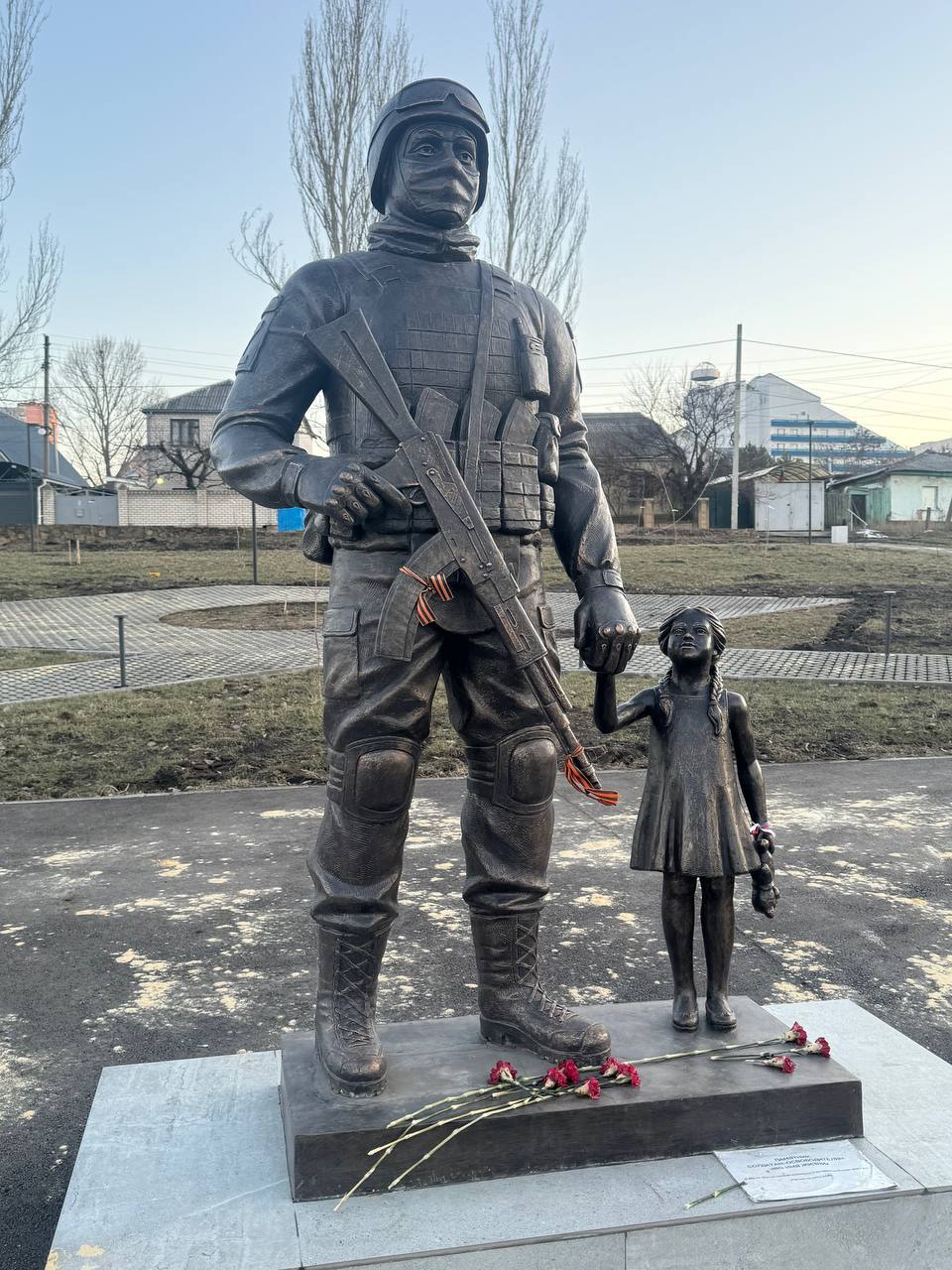Завершаю фотоподборку кадрами из сквера «Советскому солдату», который находится недалеко от Дворца культуры имени В.И. Ленина. Здесь установлен памятник «Во имя жизни»: современный защитник держит за руку маленькую девочку. Трогательное напоминание о том, что мы должны беречь мир и заботиться о будущем наших детей .