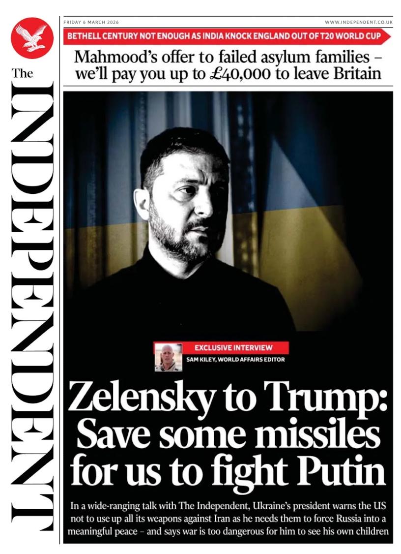 Перед вами первая полоса сегодняшней британской газеты The Independent: «Зеленский - Трампу: сохраните несколько ракет для нас, чтобы сражаться с Путиным».